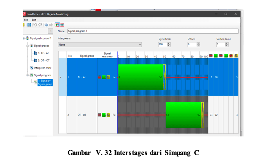 Unlike MKJI, which required assumptions on intersection types due to limited categories, Vissim allowed detailed customization of road geometry, traffic signal settings, and driving behavior parameters. This resulted in outputs that were closer to actual conditions and more reliable for planning.