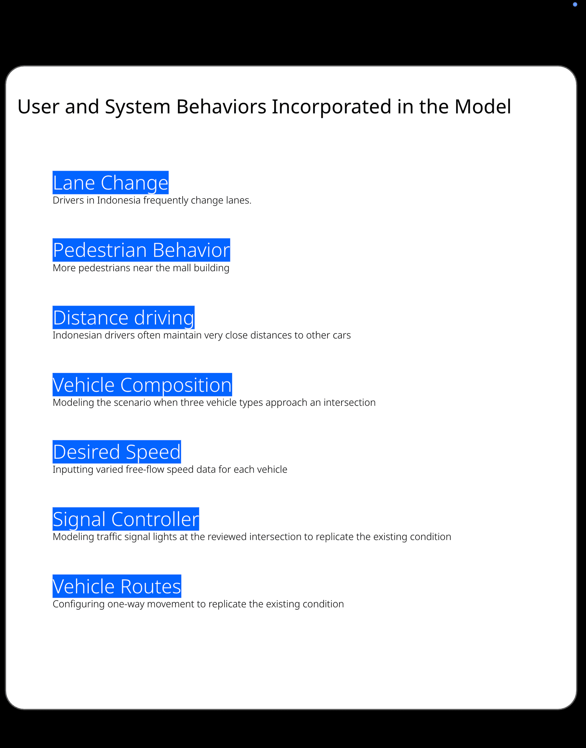 Built a PTV Vissim microsimulation model that combined system rules with real-world driver and pedestrian behaviors.